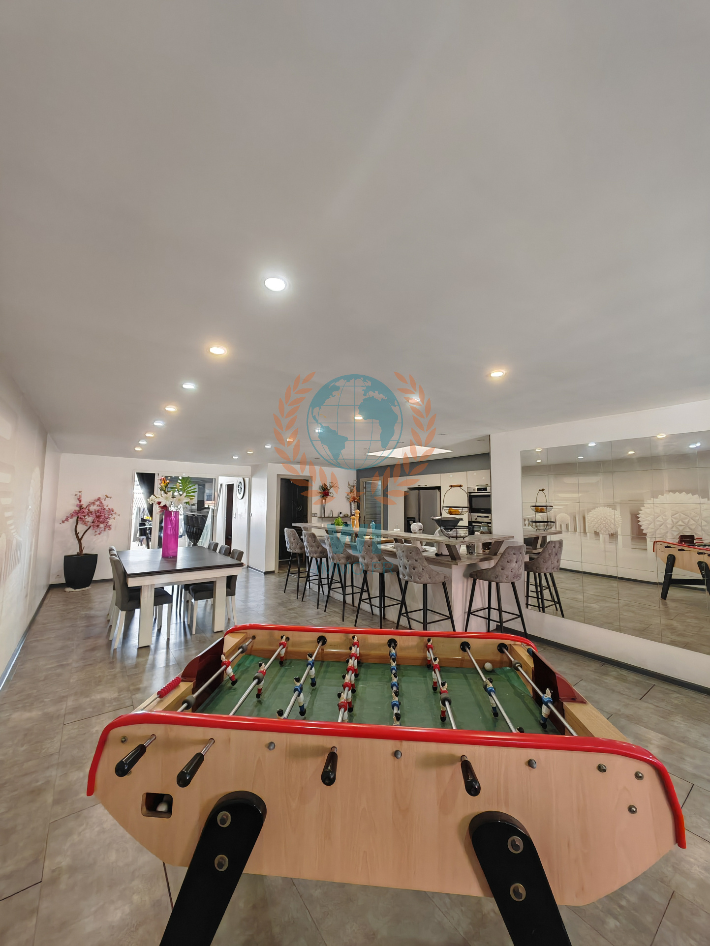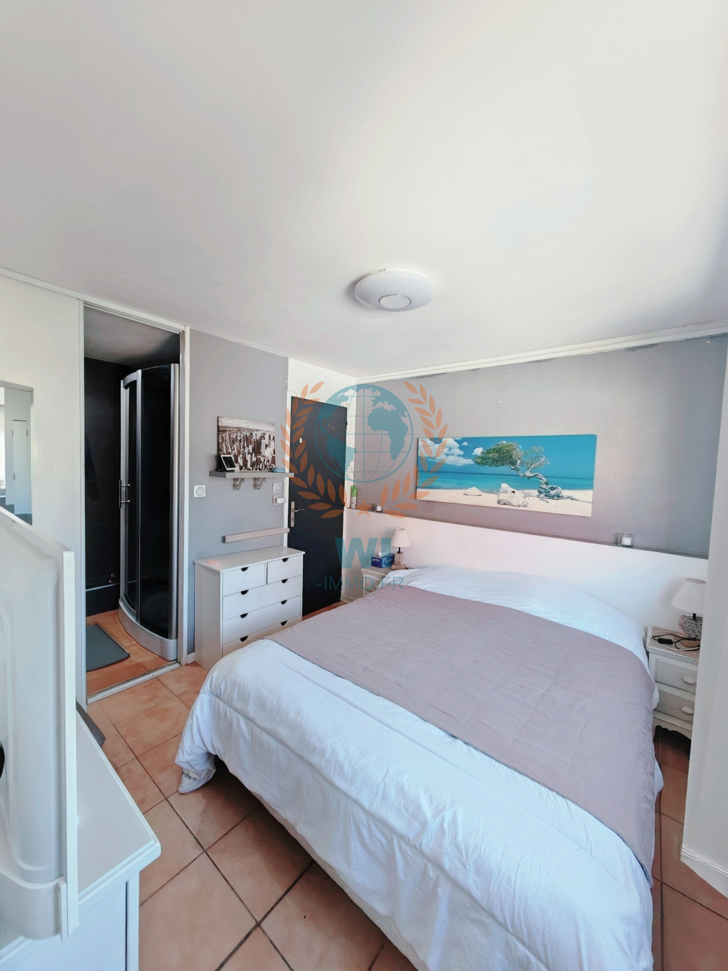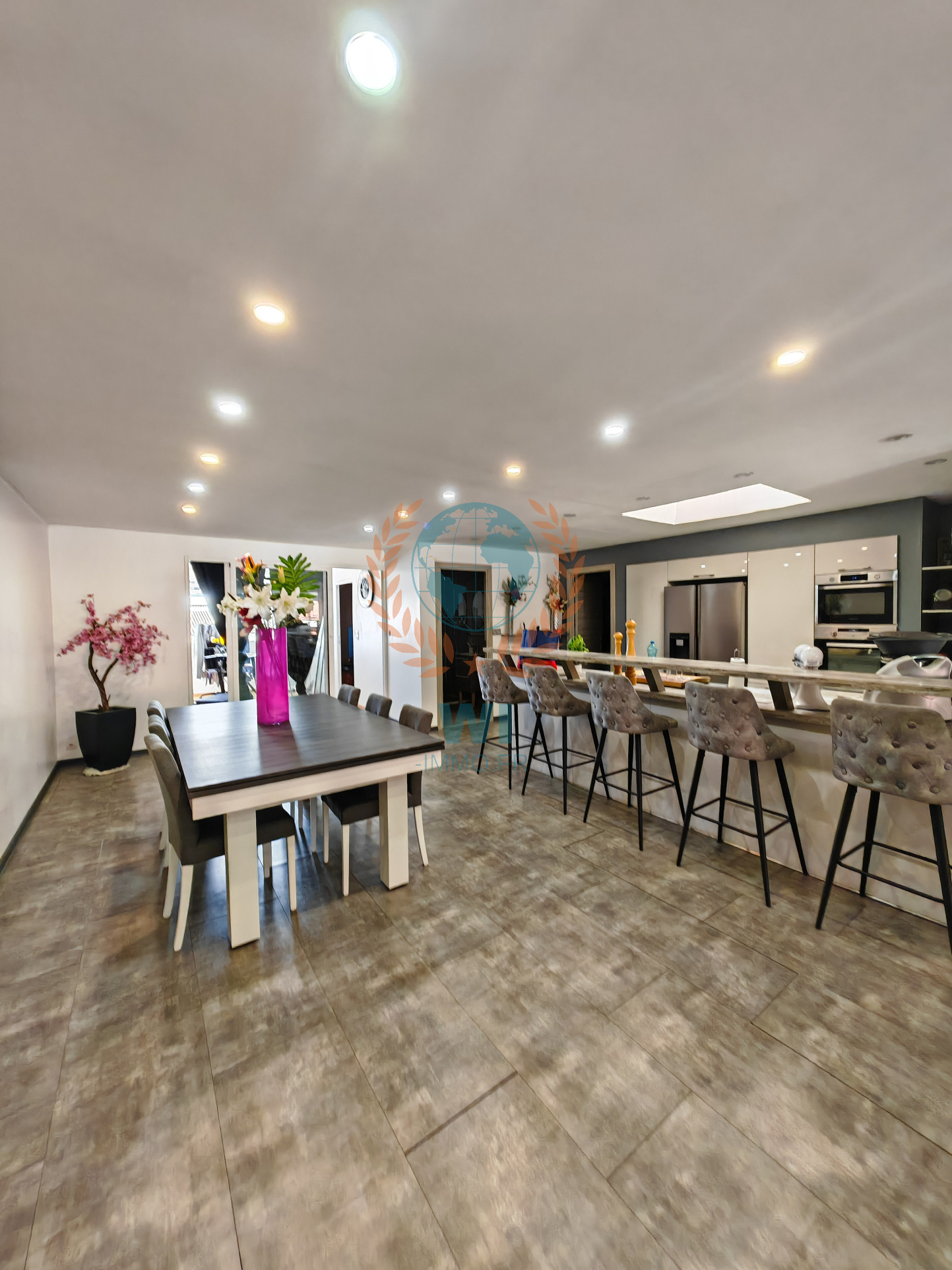 À l'étage : Un appartement spacieux de 135 m². Il se compose d'un vaste salon/ salle à manger, une cuisine ouverte entièrement équipée, une buanderie, 1 chambre avec salle de bain et WC, 1 chambre avec salle de douche et WC indépendant, un bureau, un dressing, une salle de douche avec wc.