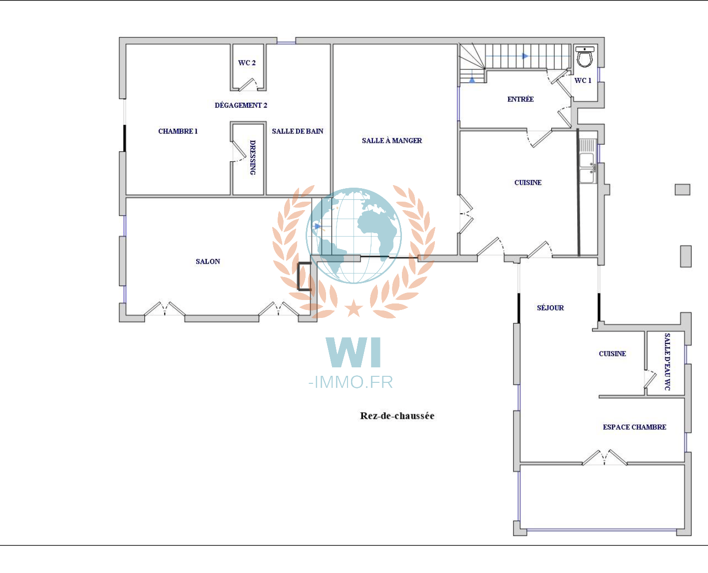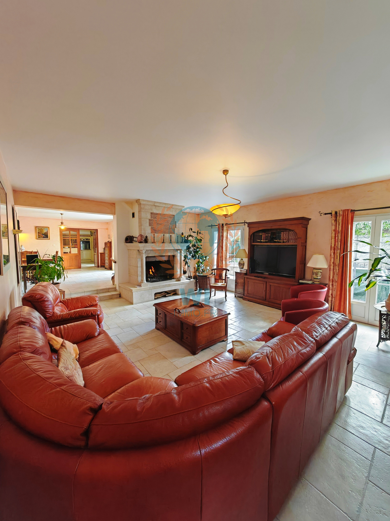 Elle se compose d'une entrée avec toilette inviter et placards, une cuisine équipée spacieuse et indépendante, une vaste salle à manger de 50 m², un double séjour avec cheminée en pierre de 40 m². Au même niveau une suite parentale de 34 m² avec une salle de bains et douche, un dressing et un WC indépendant.