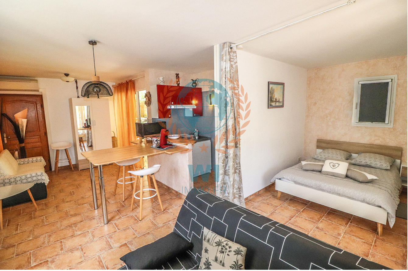 Une porte depuis la cuisine permet un accès direct à un studio de 34m² composé d'un salon/salle à manger/cuisine, un espace chambre, une salle d'eau avec WC.