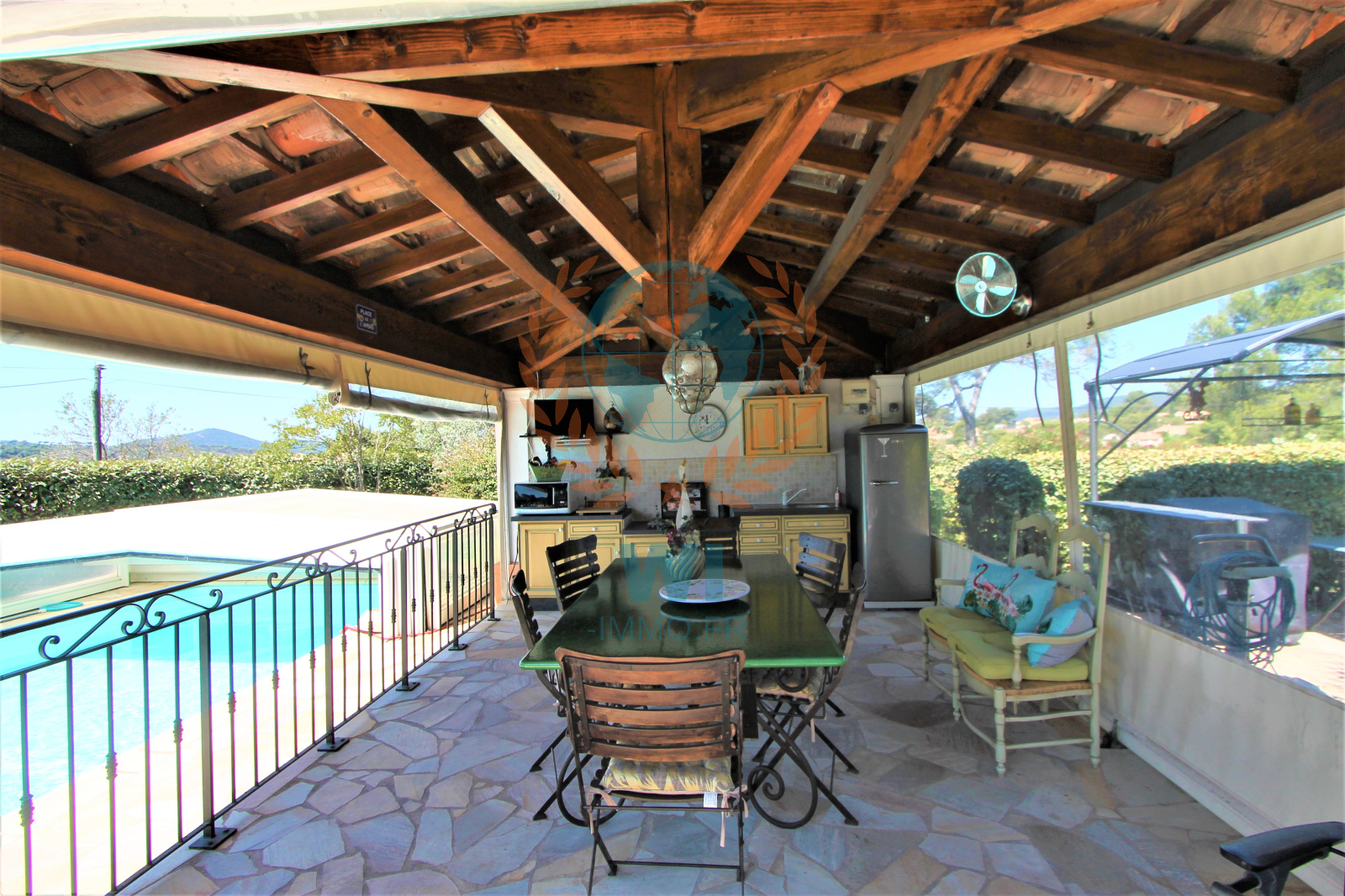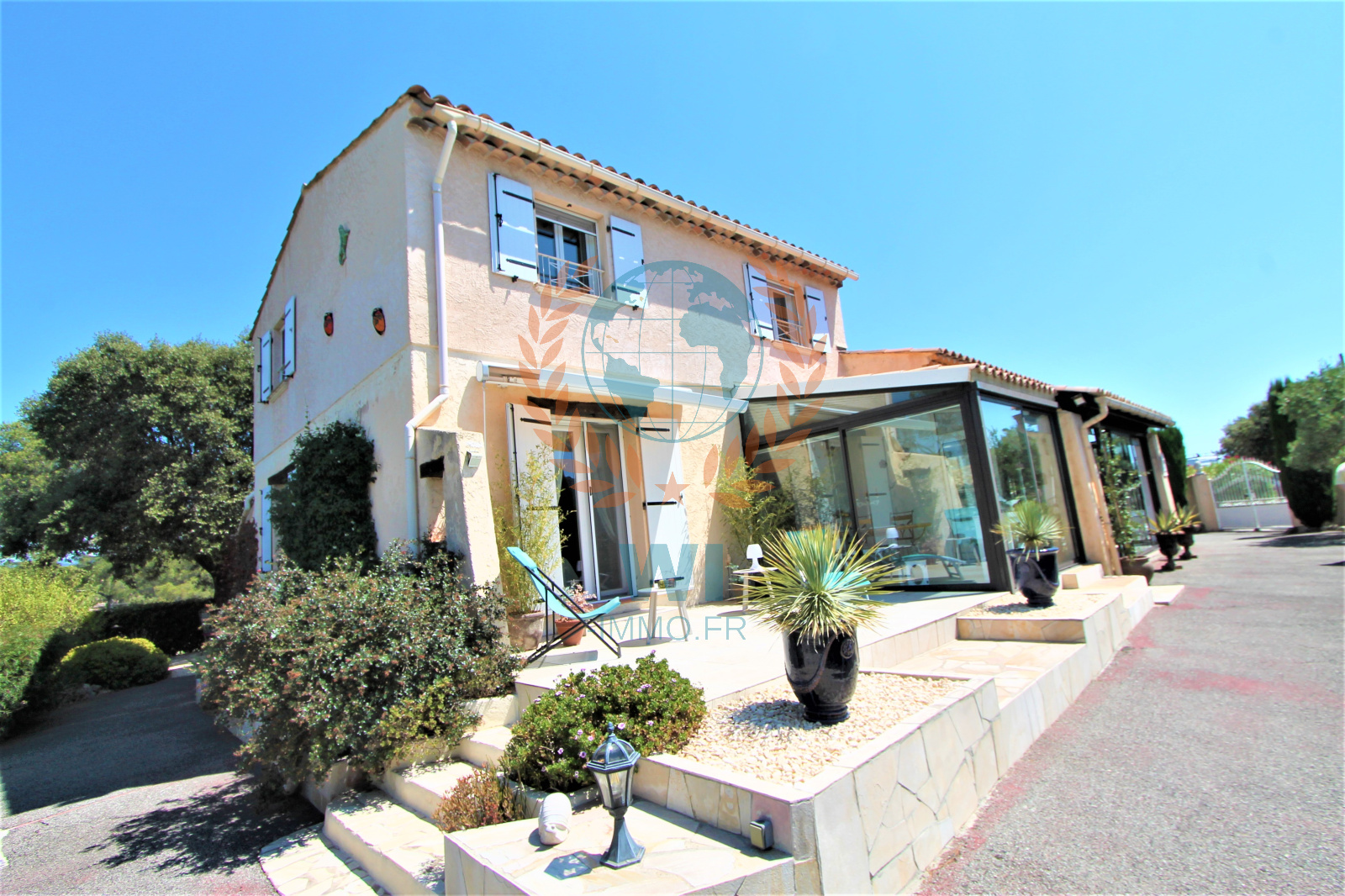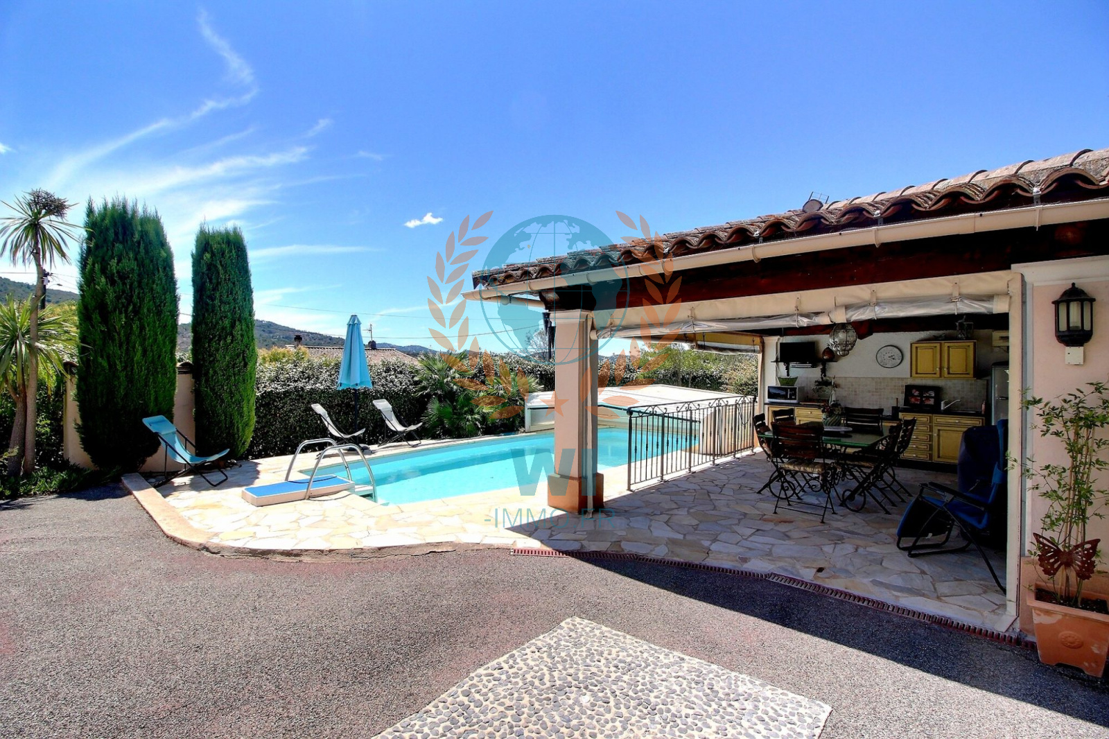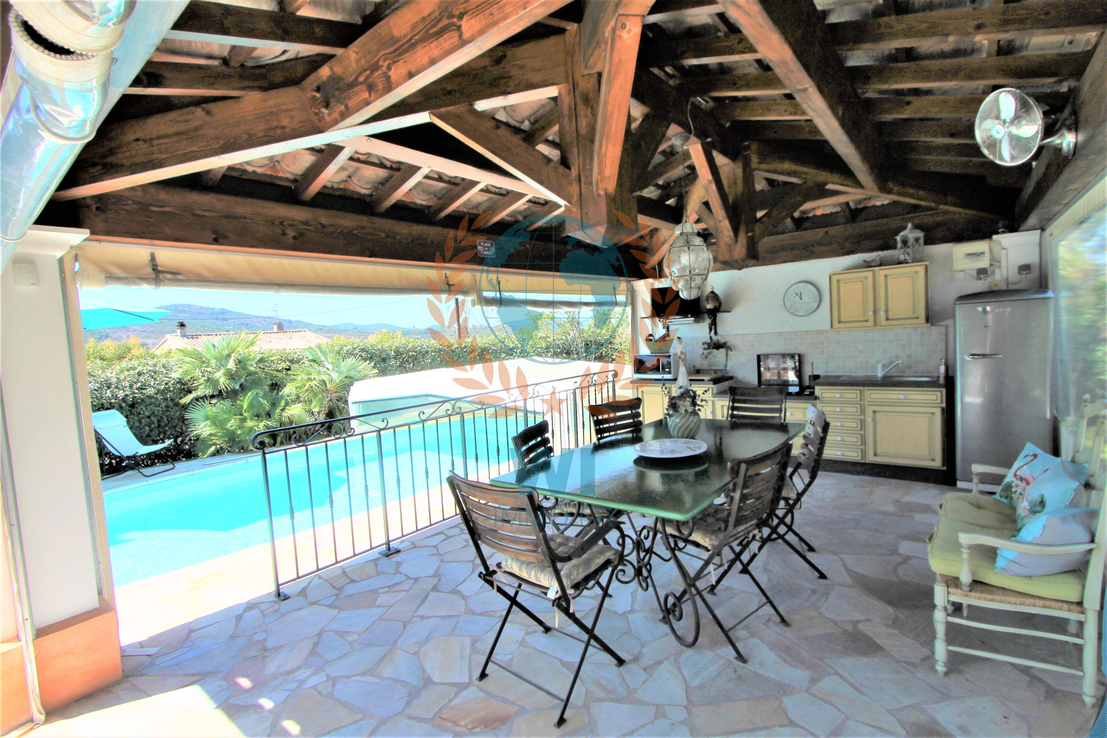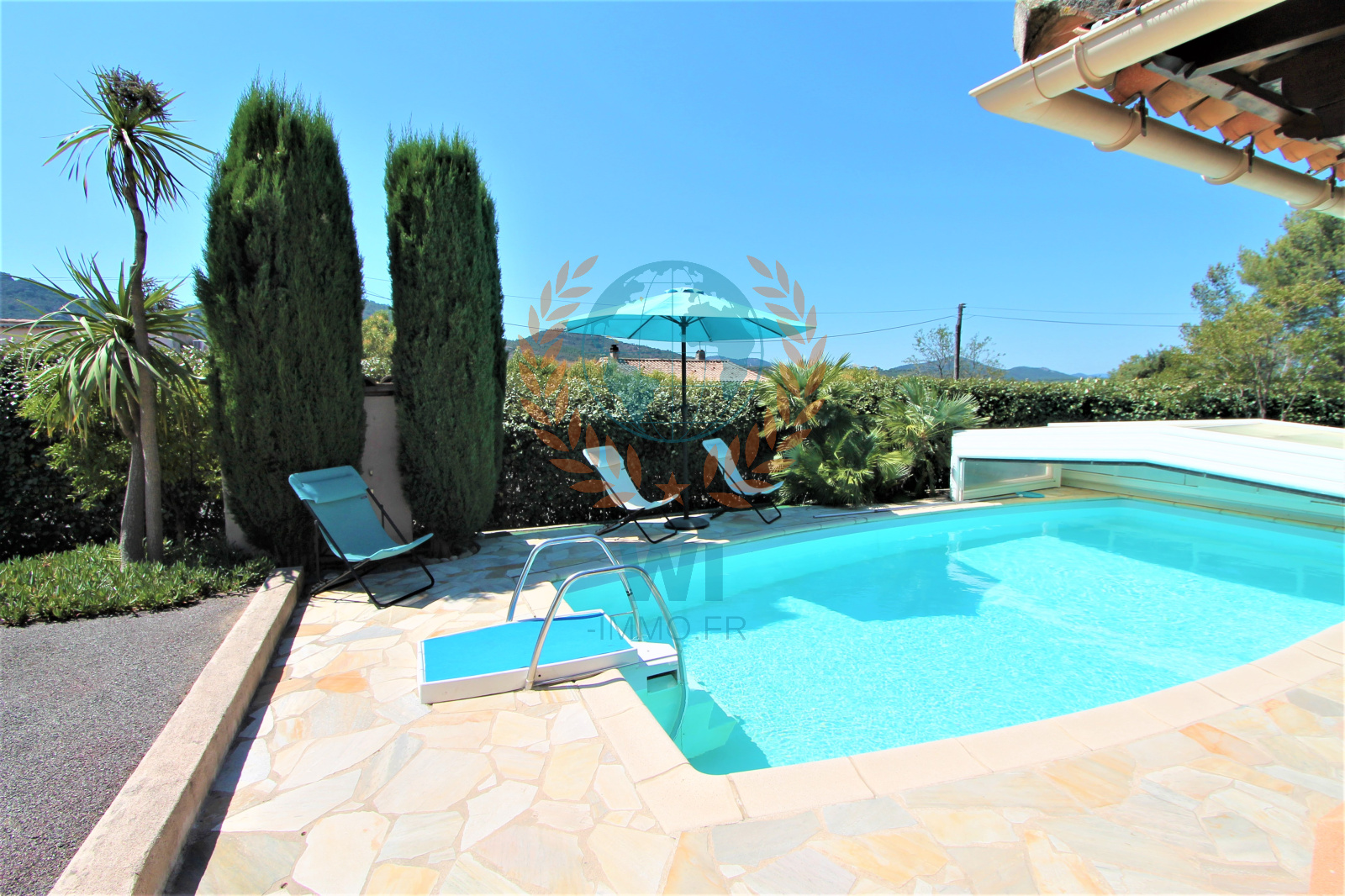 Le Muy (83490)Co Exclusivité ! Dans un quartier calme et recherché, grande villa individuelle de 175 m² en une position dominante et offrant une vue à 360 ° composée d'un salon séjour avec cheminée, une spacieuse cuisine indépendante équipée, une véranda, une chambre, salle de bains et dressing. A l'étage : 2 chambres, une salle d'eau, un bureau. Un studio de 16 m² entièrement aménagé. Un abri voiture, beau jardin paysagé et clôturé avec une piscine de 8 x 4 m couverte avec un pool-house et sa cuisine équipée. Très belle vue dégagée sur le Rocher de Roquebrune, exposition plein sud. Etat impeccable, aucun travaux à prévoir !! rare à la vente.